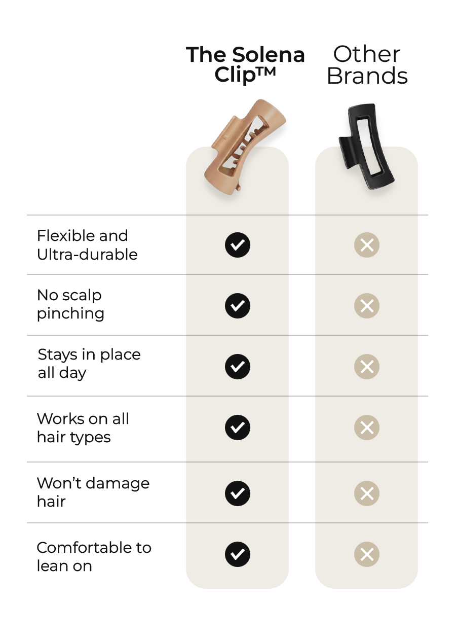 Sponka Solena je navržena pro pohodlí, odolnost a přilnavost, takže se nezasekává, nezařezává do pokožky hlavy ani nevyklouzává jako běžné sponky.